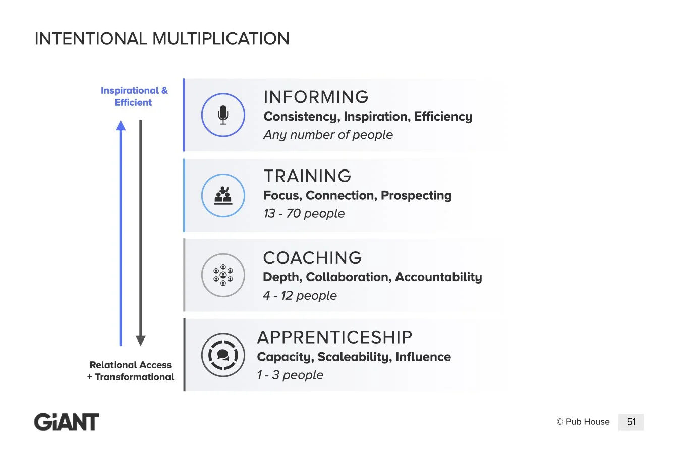 Intentional Multiplication helps leaders choose how they develop people instead of defaulting to what feels easiest or most efficient. The tool highlights four strategies for multiplication. Each one serves a different purpose and delivers a different return depending on the level of investment.